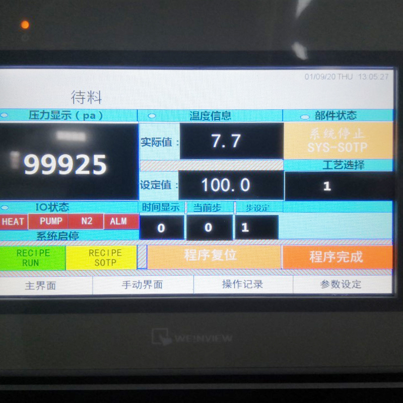 | Descrizione del processo di funzionamento dell'apparecchiatura | L'apparecchiatura utilizza la programmazione del controllo industriale PLC. Il controllo programmabile comprende lo stato di avvio/arresto della pompa per vuoto, l'impostazione del livello di vuoto, la durata di mantenimento del vuoto, il tempo di riempimento del gas inerte, il tempo di chiusura dell'elettrovalvola del gas inerte e l'avvio/termine del ciclo di riscaldamento. | ||